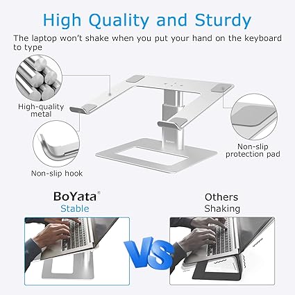 Constructed from high-quality aluminum, the BoYata Laptop Stand combines durability with a sleek design. Its robust frame ensures that it can securely hold laptops ranging from 11 to 17 inches without wobbling or tipping over. The anti-slip pads on the base and laptop support keep your device securely in place while protecting your surfaces from scratches. This sturdy construction provides peace of mind, allowing you to work confidently without worrying about your laptop’s safety.