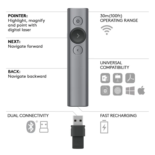 Designed for professionals and presenters who need more than just a basic pointer, the Logitech Spotlight™ Presenter – Slateenhances the overall presentation experience. With a stylish slate-colored design, advanced navigation features, and powerful customization options, this presenter takes presentations to the next level, allowing users to connect with their audience in a more dynamic and meaningful way.